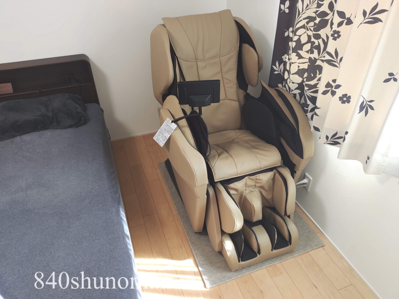 冬はこれに毛布を掛ければ朝まで寝てしまいかねなくて危険なのですが、その毛布がちょっと悩ましい。一般的なシングルサイズの毛布だと肩から足の先まですっぽり覆えるものの、エアコンプレッションなど可動部が多いマッサージチェアでは毛布を巻き込みそうになります。かと言って、小さなブランケットでは物足りない。