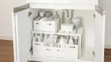 ただ、個人的にはそこまでして奥行ピッタリにする必要はないと思うんですよね。伸縮じゃなくて強度が十分に確保できるなら洗剤類のストックを収納するのに便利ですが、そうじゃないなら奥にはほとんど使わないモノを突っ込んでおいて、手前だけ従来のロータイプを使って取り出しやすくすれば十分だと思います。