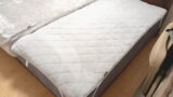 羽毛布団と比較すると、かなり薄いです。まるでベッドパッドかと思うほどの厚みしかありません。ちなみに、詰め物はポリエステル100%です。